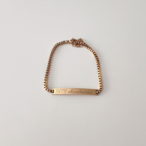 La Esclava Luna es una pulsera fina para mujer de acero inoxidable, disponible en color dorado o plateado, personalizada con el texto que tú elijas: un nombre, una fecha espacial o una palabra que lo diga todo.